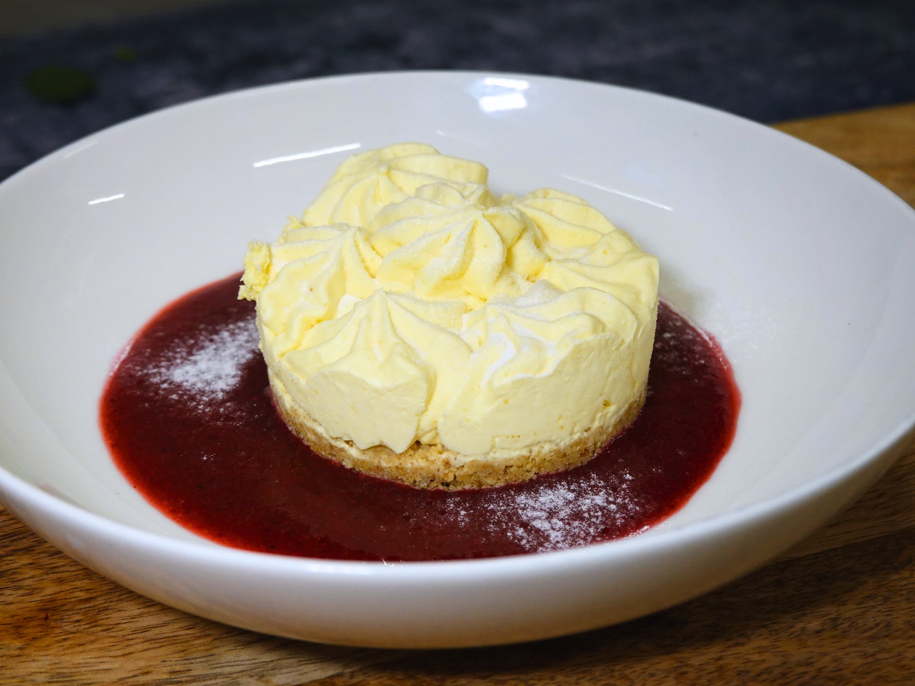 Indulge in our chef-made individual Passion Fruit Cheesecake; chef made desserts just perfect for home dining. A buttery biscuit base supports a luxuriously smooth, creamy cheesecake topping with a kick of vibrant passion fruit tropical tang. Each bite is rich, refreshing, and elegantly finished—sweet, silky, and slightly tart.